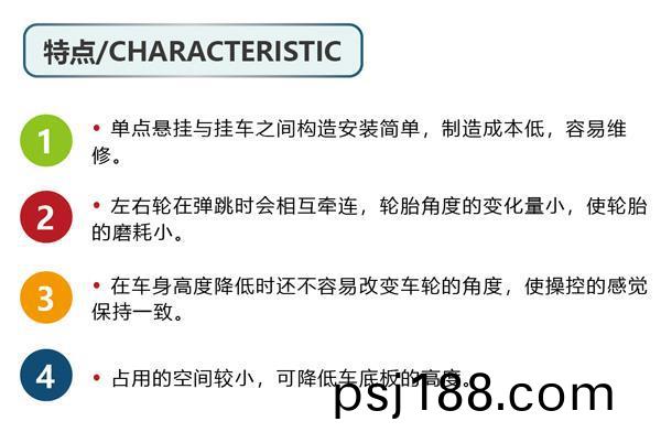 2、左右輪在彈跳時會相互牽連(lian),輪胎(tai)角度的變化(hua)量小(xiao),使輪胎的磨耗小(xiao)。